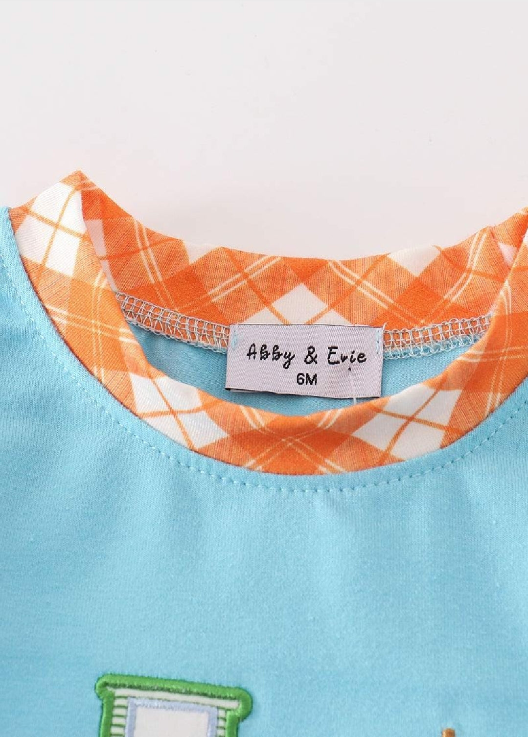 Get ready for fall with this adorable blue truck pumpkin applique boy bubble! Made with soft fabric and cute embroidered details, this bubble will have your little one looking stylish and feeling comfortable. Perfect for pictures, playdates, and pumpkin patch adventures.