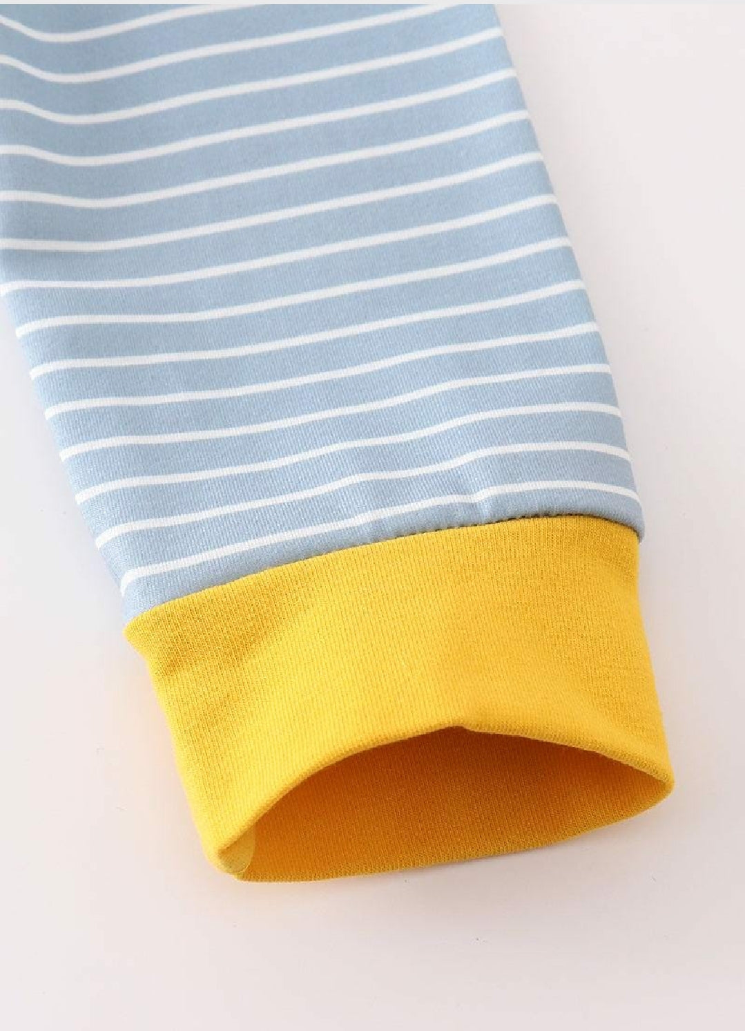 Gobble up the compliments with this charming blue stripe turkey french knot boy set. Perfect for adding a touch of whimsy to any outfit. Don't be a turkey, add this set to your wardrobe today!