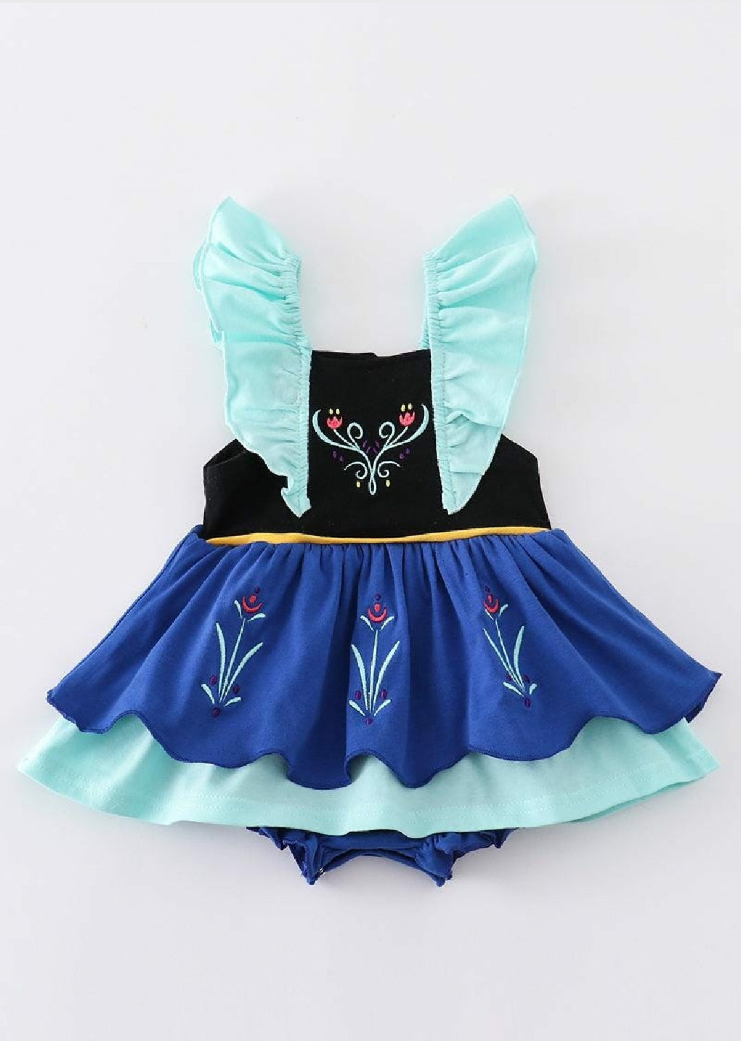 Show off your little fashionista in this Navy Anna embroidery girl bubble! The intricate embroidery adds a touch of whimsy to this classic design. Made with soft and comfortable fabric, it's perfect for everyday wear or special occasions. Your little one will be the talk of the town!