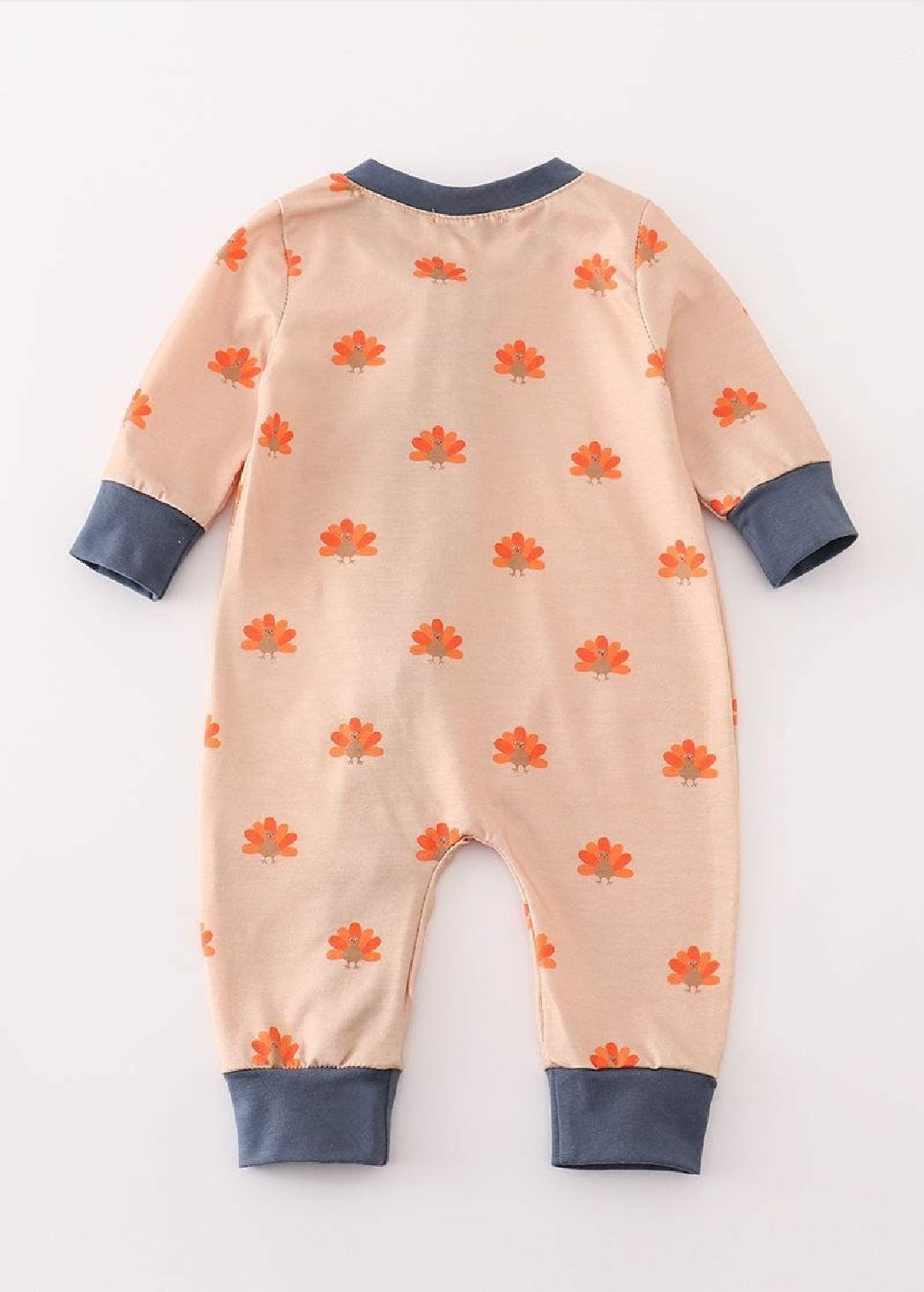 Gobble up this adorable Khaki turkey print romper for your little girl! With a convenient zip closure and fun turkey print, your child will be stylish and comfortable all day long. Perfect for Thanksgiving or any day of the year.
