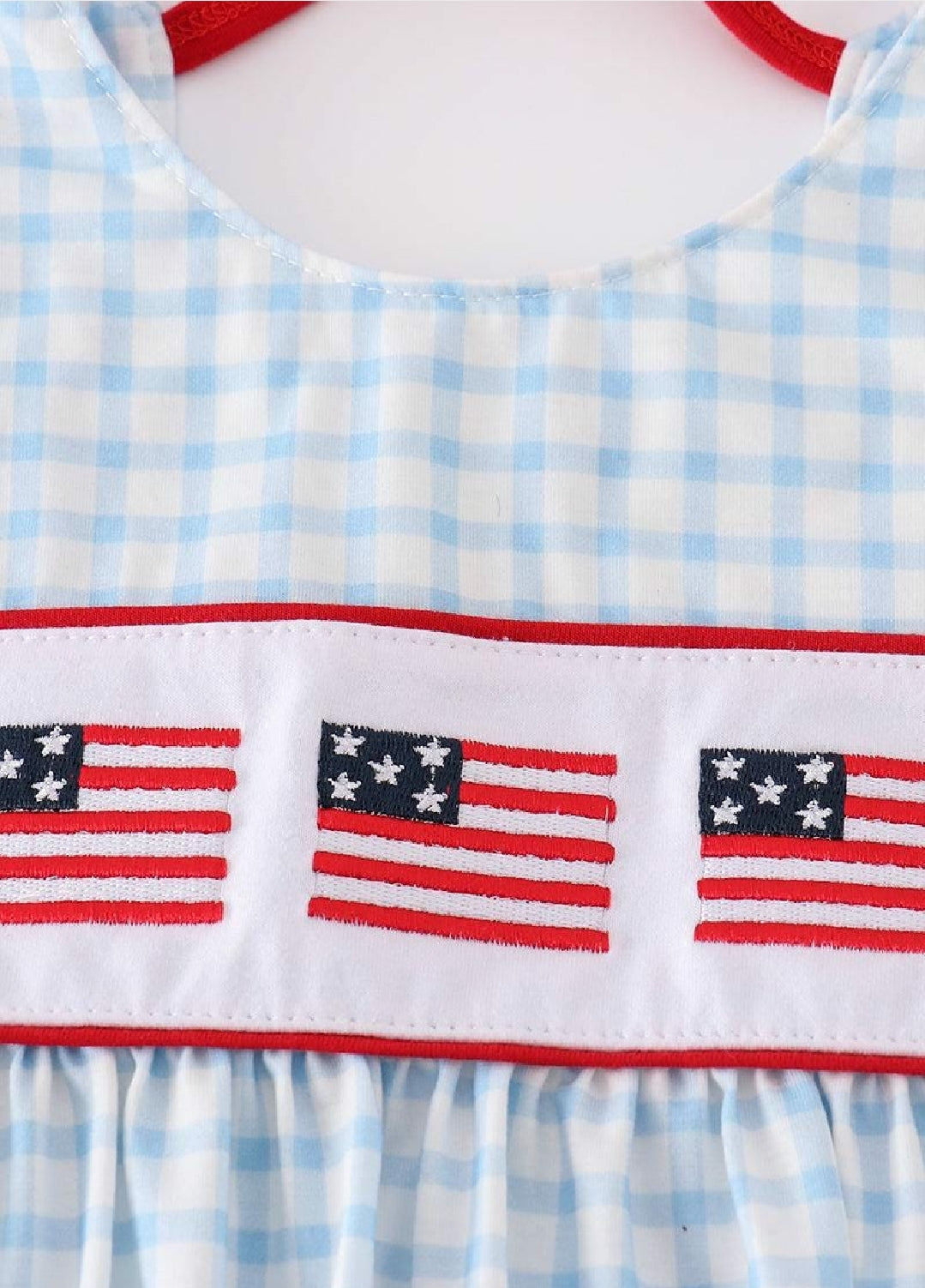 Girl's Boutique Patriotic Checkered Flag Red And Blue 2 Piece Short Set Embroidery Embroidered 4th of July Sibling Matching