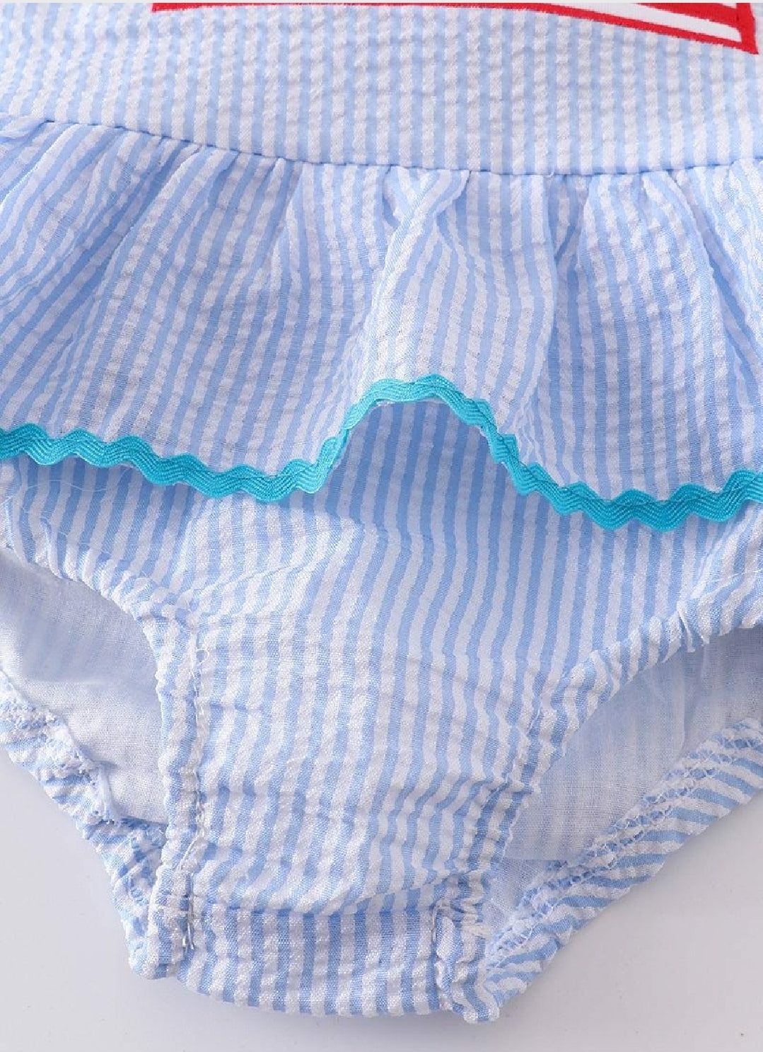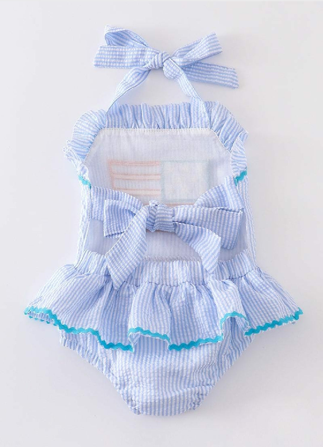 Jump into the pool with patriotic pride in this adorable blue one-piece girl swimsuit! Featuring a fun flag applique design and comfortable seersucker material, this swimsuit is perfect for any summer adventure. Show off your love for the USA while staying stylish and comfortable in the water.